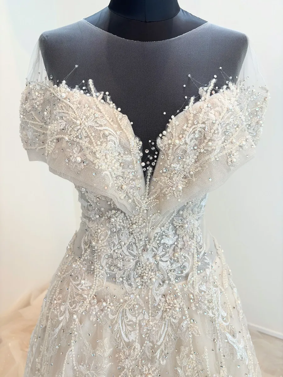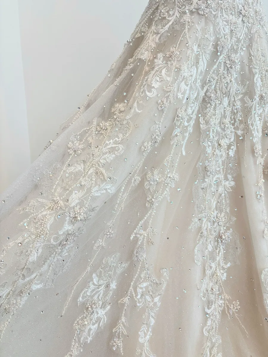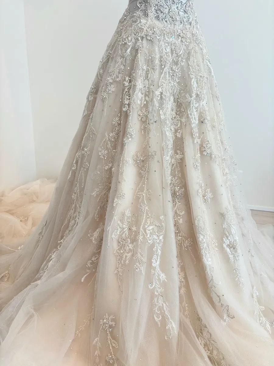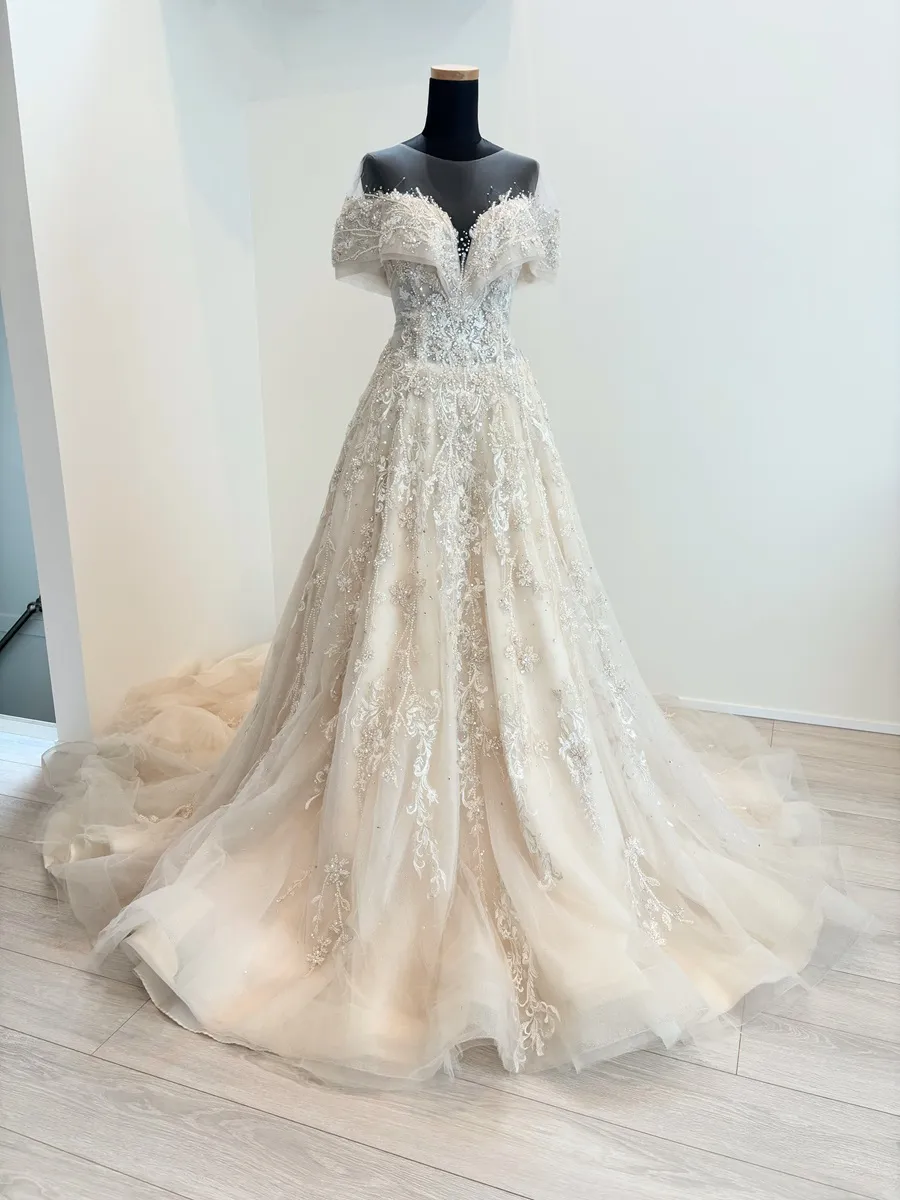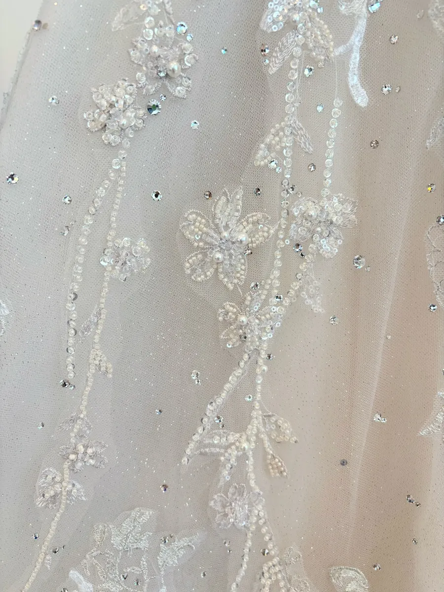 エレガントな模様の刺繍と桜をモチーフにしたビーズ装飾がかわいらしい1着。ほんのりピンクがかったアイボリーカラーです。