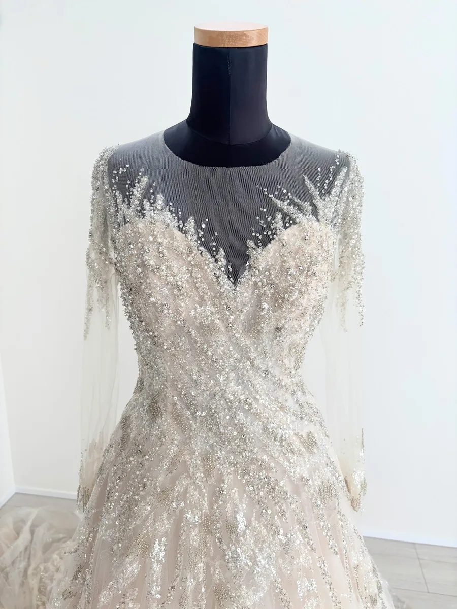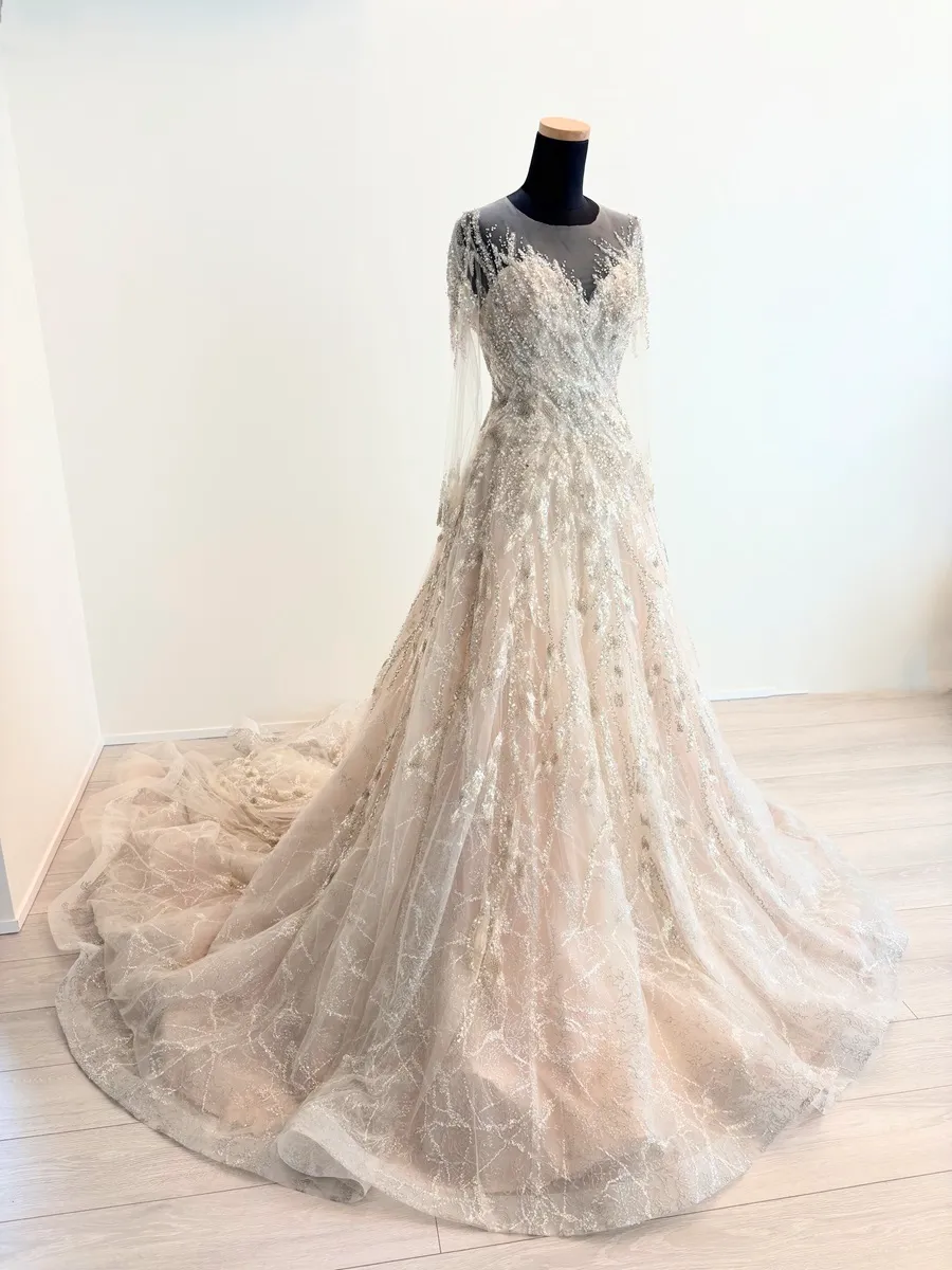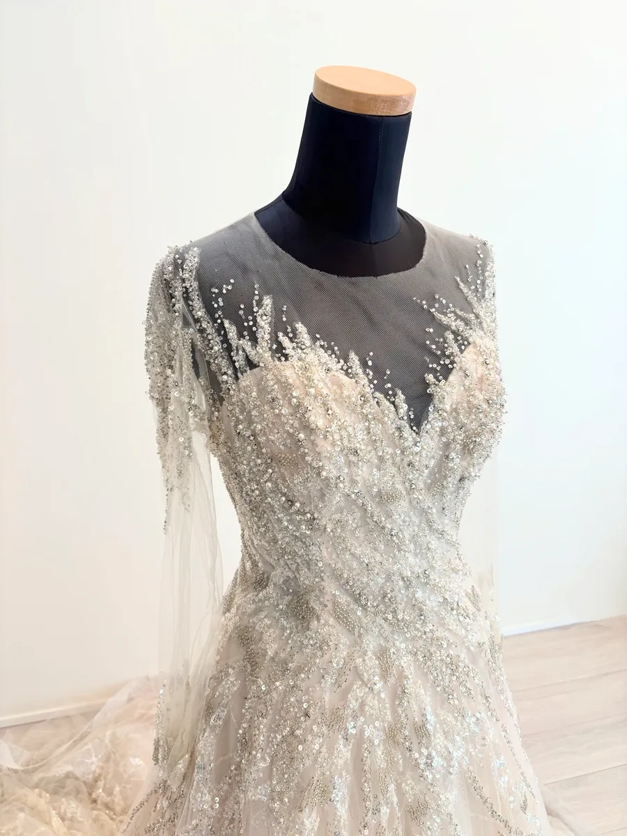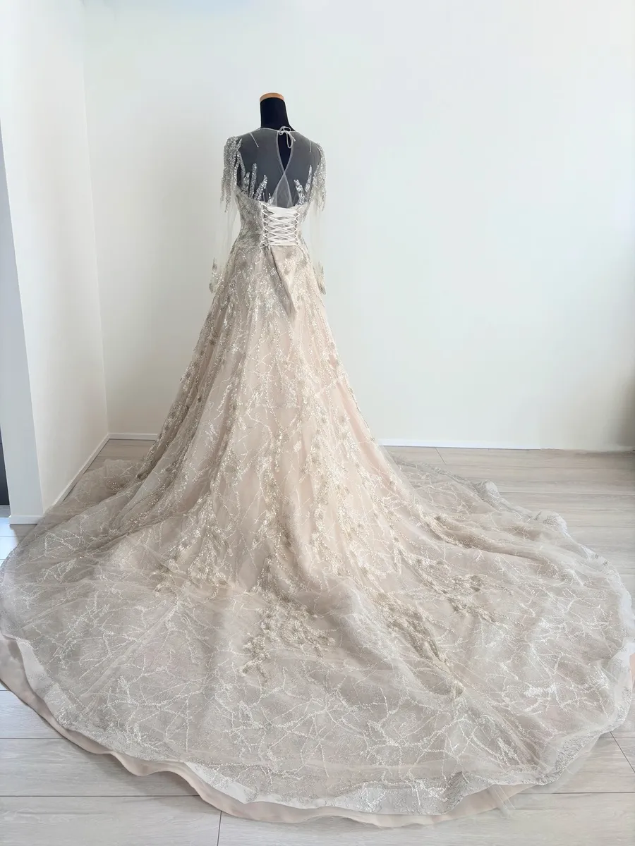 中央部分はレースのみの長袖なので、素肌にぴったりはうようにビーズの刺繍が映えるエレガントなデザインです。