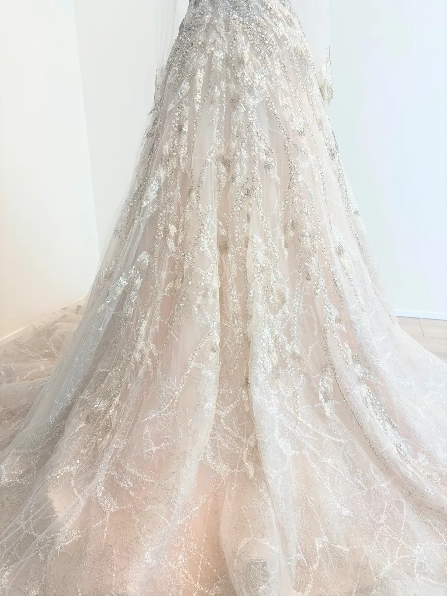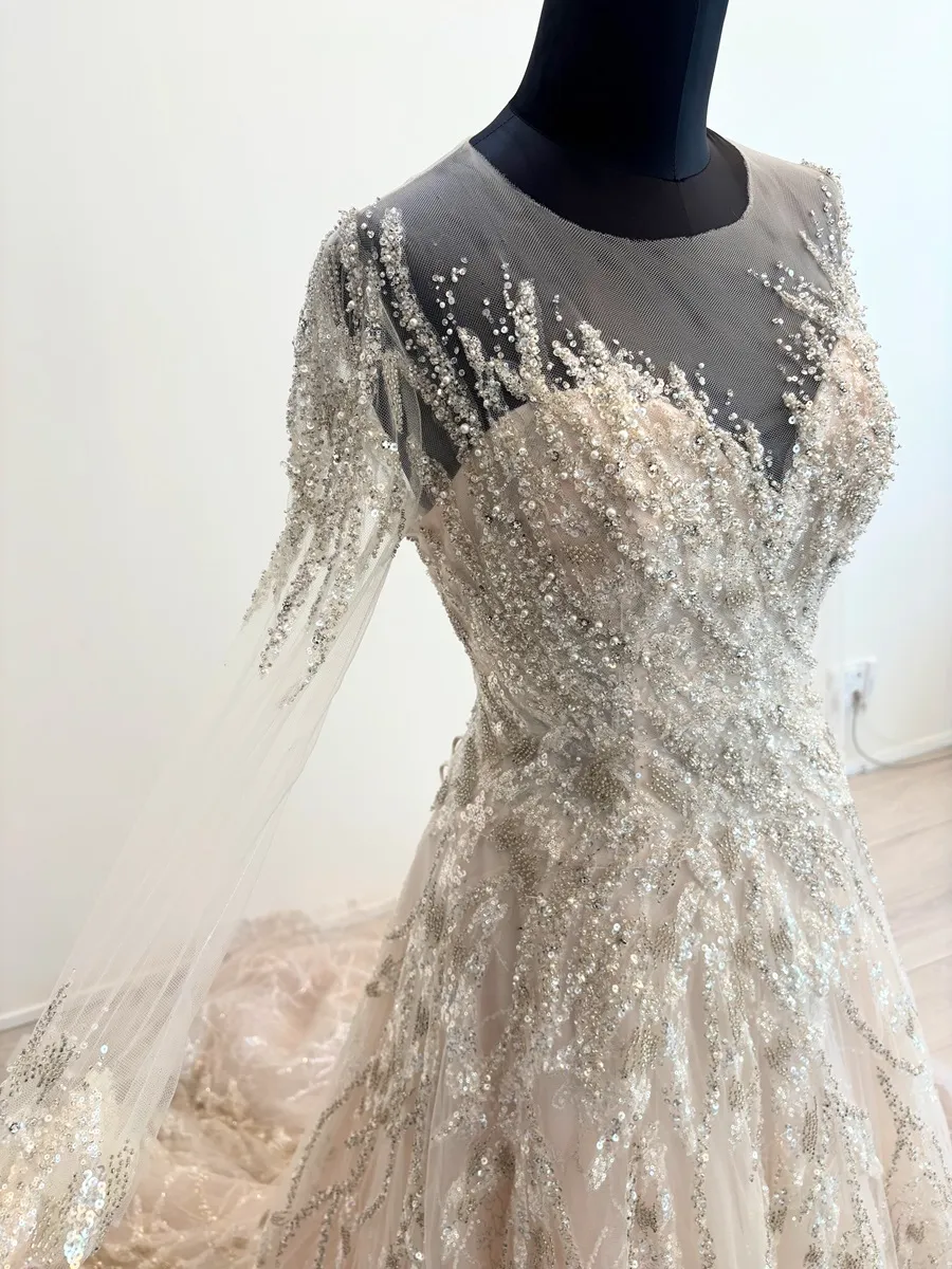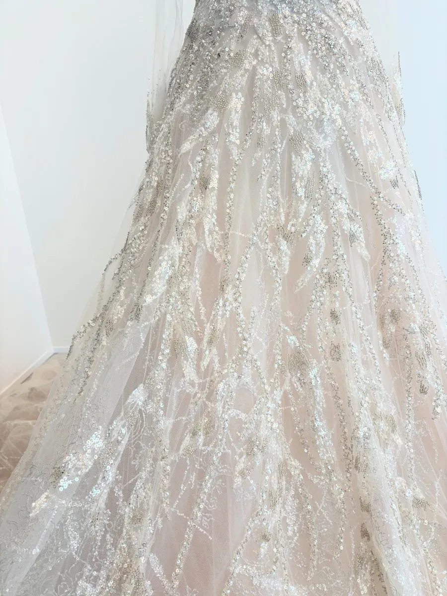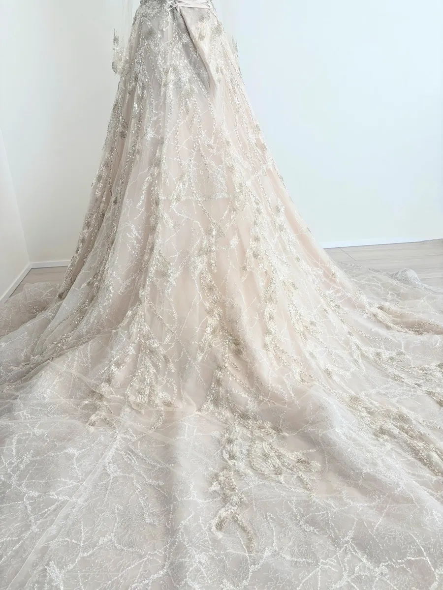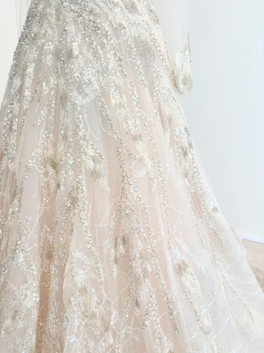 中央部分はレースのみの長袖なので、素肌にぴったりはうようにビーズの刺繍が映えるエレガントなデザインです。